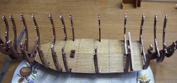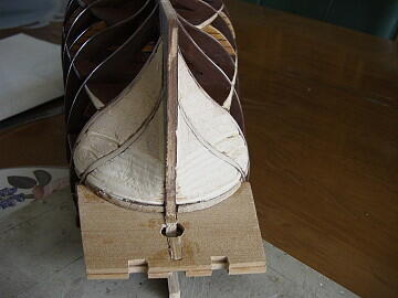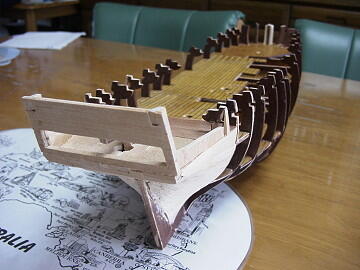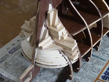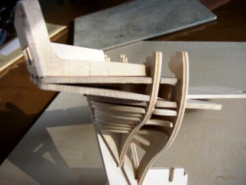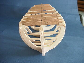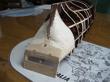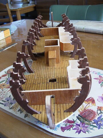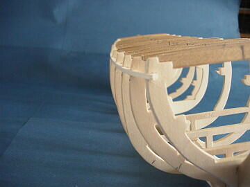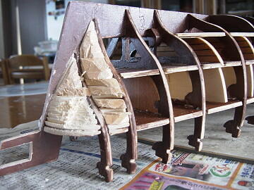 船尾部分に取りかかる時に倒産したため、このままでは外板も張ることが出来ない状態になるので資料を参考に組ん でみた。ここまで組んでしまえば船の全体像が掴めるようになる。