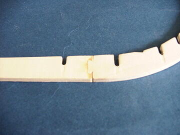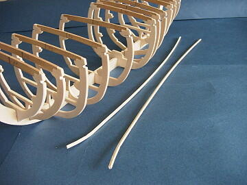 前回作成したカティサークの時、フレームの修正に泣かされたので、今回は糊付けする前に全体を仮付けしてフレー ムを修正する。さらに狂いが出ないようにストリンガーを追加することにした。