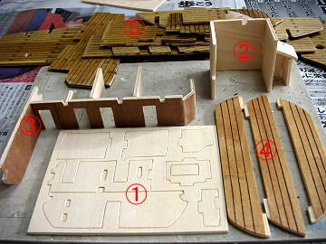 ここまで部品が揃うといよいよフレームにそれぞれの部品を接着する。また設計図にはカマドがあり、煙突が上部デッ キからニョッキリと突き出ているのでこれも自作するつもりである。