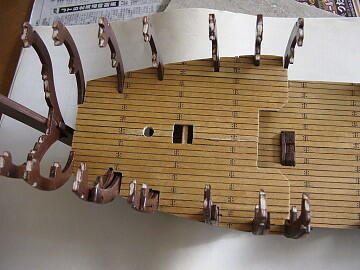 この仮組みで修正が終了した後、ストリンガーとフレームを固定する。上甲板のビームは船体内の処理があるので外 す予定でいる。ここまでの作業が終わると、いよいよ船体内部の作成に入ることになる。
