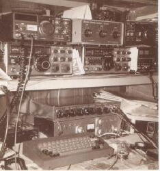 | |  | OSCAR 6,7号をこのアンテナで衛星を追跡しまし た。このシステムは方位はもとより仰角も変えることが できましたが、追跡はチャートを見ながら手動作でし た。一方、電鍵も叩かなくてはなりませんでしたので手 が何本あっても足りないくらいでした。 | | シャック全体。雑然としています。性 格がもろにでている感じです。上段 はリグ関係。下段はRTTYやSST Vの付属品です。すべて自作品で す。キーボートも作りました。 |