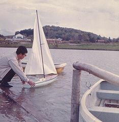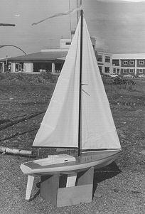 (1)船体はできるだけ軽くするためバルサ材を主体に作り上げています。船腹の中央部は2段になっていて、水の抵 抗をなくすように工夫しました。船体上部は幅を広くして復元力を増すようにした。バラストは石膏で型を作り、鉛を溶か してアメリカズカップ艇のような形に仕上げました(当時はこの競技は知りません)。甲板は細い板を何時間もかけて張り 付けました。