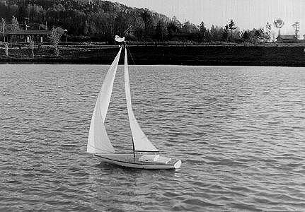 コントロールはラダー、トリム(センターボードに取り付け)、メインセール、ジブセールの4チャンネルを使用した。 これで実物のヨットの操作はすべて行えるようになり大満足。なおメインセールとジブセールは単にスイッチを押すだけ の構造で糸を巻き取るギアボックスを作動させるものです。これでセールを左右に振り分けたり、角度の調節もできるよ うになりました。ジブとメインを左右に広げてランニングも可能でした。もちろんリミッタースイッチも設置してあります。 もう一つ付けたかったものにスピンネーカーです。これの上げ下ろしができればランニングにもっとスピードが出たと確 信していましたが、残念ながら付けることはできませんでした。動力源は模型用の鉛バッテリーを使用して、何時間も遊 ぶことができました。