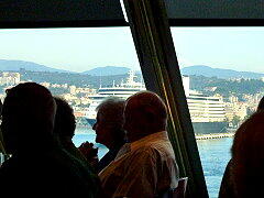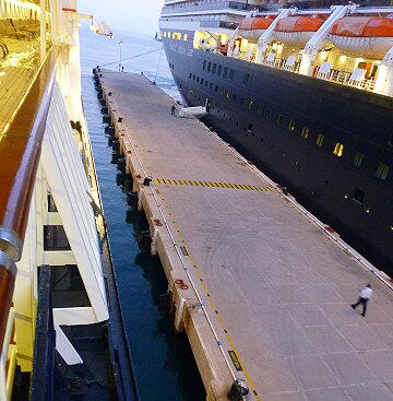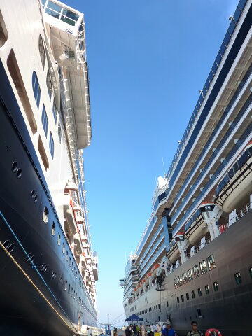 こんな狭い桟橋に巨大船が2隻も停泊するとまるでビルの谷間を歩いている錯覚に陥る感じである。