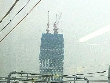 押上駅へ向かう電車内から東京スカイツリーの巨大な工事現場を見ることができた。まるでビルを建てているよう