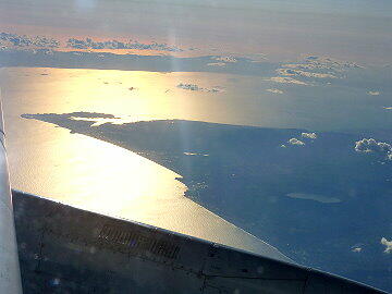 すれ違う旅客機発見 下北半島の尻屋崎が見える。向い側は北海道