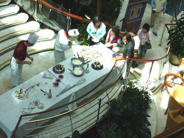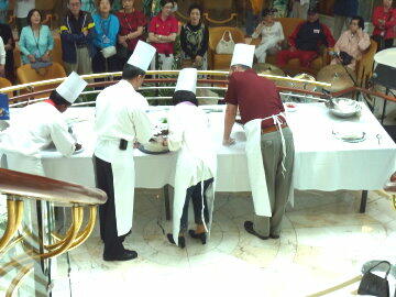 菓子作りの実演を見ようと各階に黒山の人だかり