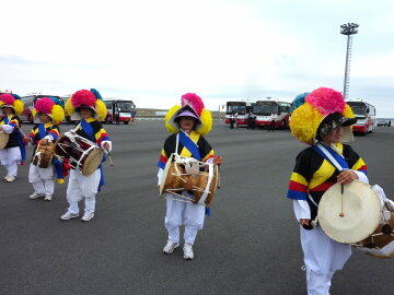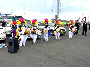 岸壁では地元のおばさん達が民族衣装と踊りでお出迎え。おまけに飲料水まで貰った。いかに韓国は観光に力を
