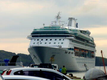 テンダーボートから本船を眺めるとその巨大さがよくわかります