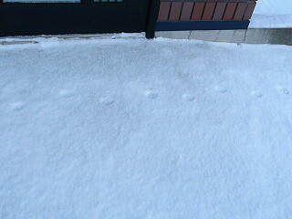 キツネの足跡 朝起きてみると、我が家の周りをこのような足跡が点々と続いておりました。キツネの訪問を受けたようです。この時期になると必ず数回は訪れます。日中でも道路を横断するのを見かけたことがあります。餌なんて無いのによく人里まで降りてくるとは余程、山には餌がないのかも知れません。熊のように冬眠すればいいのになと思ったりしております。 |