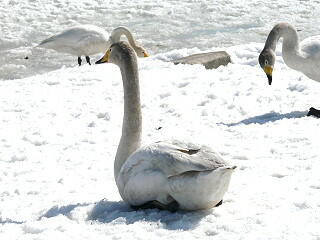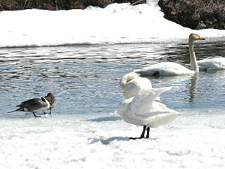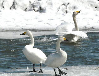 未だ雪が残っているのに気の早い白鳥が当地に飛来し始めている。本州で越冬した後、陽気に誘われて順次シベリアへ帰る準備に入っているようだ。