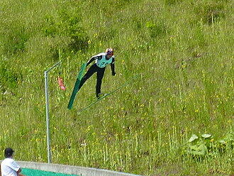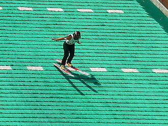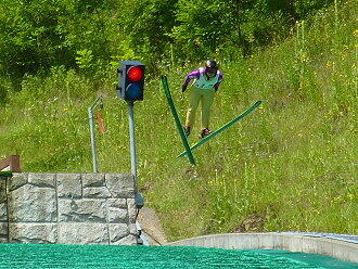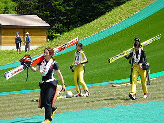 会場の朝日三望台シャンツェ(HS68メートル、K点60メートル)に到着するとすでに練習が始まっており、選手が次々と飛んでいた。服装は雪の時と同じものを使用しているらしく、飛び終わると暑いのか、すぐ上半身を脱いでいた。今日は夏日なのでとくに暑かったかも知れない。最近の大会には女子選手が多く参加しているのには驚いた。