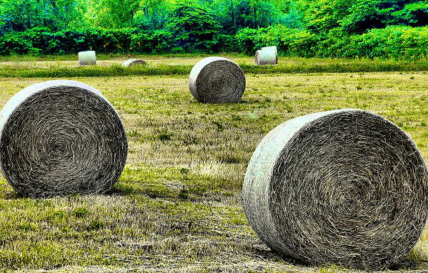 牧草のロール。この後、腐らないようにビニールでグルグル巻きにします。 |