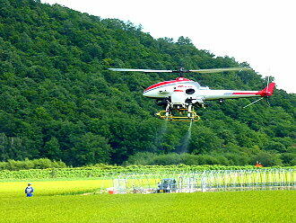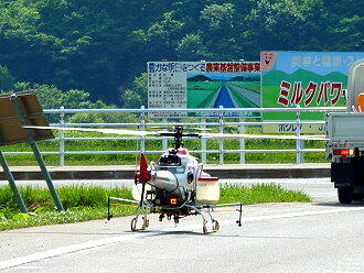 HPの表紙用写真を撮りに出掛けた帰り道で、RCヘリで農薬散布を行っているのを見つけ、しばらく作業を見物した。ヤマハのRmaxという機体で一時輸出問題になった曰く付きの機体である。