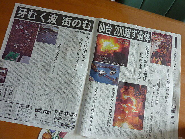最初の地震から3日経つが、未だに余震が続いており、終息するにはまだ相当な時間が掛かりそうな感じがする。津波が襲ったのは北海道から東京までの東日本全域で、水が引いた後はまるで戦時中の空襲後の風景にそっくりである。国際援助隊も続々と現地入りしているが、どこから手を付けていいものか、苦労しているに違いない。犠牲者も1万人を超える勢いである。それでも海に流された人が救助された幸運な人もいるので、救助隊は最後まであきらめないで頑張って欲しいものです。