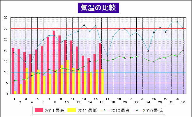 先週、ようやく気温が上がり始めたと思ったら、その後、次第に気温が下がり始めて、最高気温が20℃を割る日が3日も続いた。昨年の気温と比較してみるとその差は歴然としている。今後、天候が持ち直してくれれば良いのだが、こればかりは雷様に聞かないとわからない。