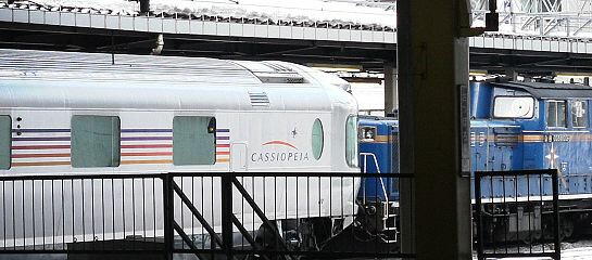 降りたホームの向かい側にカシオペアが入線してきた。かっこイー!DD51の重連でこの夜行列車を函館まで牽引する。重連ににする位ならJR貨物のDF200を導入してはどうなのかなと思う。これなら電気機関車と同じ走りぷりができるのだが・・・。しかし、のんびり夜行寝台車だからこれでもいいのか。それにしても一度はこれに乗って旅行をしたいものだ。