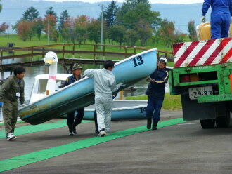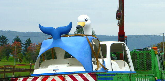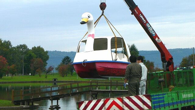 4月下旬から始まった水郷公園のボートの営業が昨日をもって今シーズンの営業を終了した。今日は長い冬ごもりのためボート類の引き上げが行われ、トラックに乗せられて格納倉庫へ移動していきました。