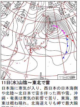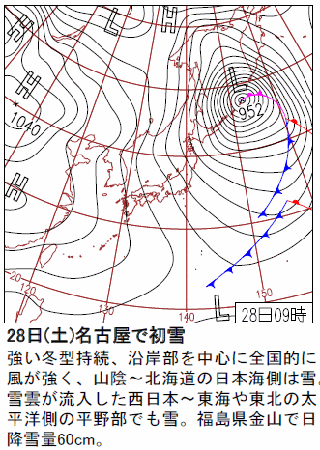 今回の低気圧は「数年に一度」というが昨年の12月も今回に似た低気圧が2,3回 発生しています。このような気圧配置は毎年発生しているので「数年に一度」 というフレーズ止めるべきでしょう。 参考 http://www.data.jma.go.jp/fcd/yoho/hibiten/index.html |