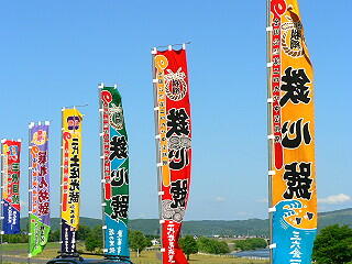 一人前に幟を持っている 公園の一角に臨時の闘犬場を設置