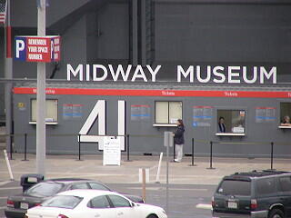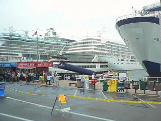 ズラリと並んだクルーズ船。4隻停泊中 我々の横に停泊していた空母ミッドウエイ