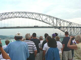 アメリカ橋 太平洋側の閘門 朝6時過ぎに運河に到着。最初に見えるのがアメリカ橋である。この道路は南北アメリカをつなぐ重要な橋という。間もなくこの運河の特徴である閘門に近づく。運河と本船の間は1bもないのでスリル満点である。よく見ると船がこすった後があちこちに見ることができた。