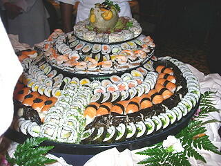 夜はシェフが腕によりをかけた「ガラ・ハッフェ」が催された。これは色とりどりの食材を使用した、それは素晴らしいできばえでした。一通り見物した後は各自自由に食べることができたのですが、なにしろその時間が夜中の0時からとてうことで食するのはパスしました。さぞかし味もよかったのではないかと思います。 |