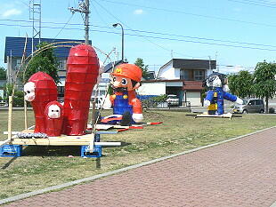 マンネリ化したあんどん行列はあまり見る気にもならなかったので、翌日、散歩がてら学校付近を見たら、前庭に例年のようにあんどんが飾られていました。昨年は6基と寂しいものでしたが、今年は統合されて9基に増えたようです。来年はさらに増えて16基になるかもしれません。それにしても、最近のあんどんはあまり変わり映えがしないあんどんばかりで、ちょっと残念な気がした。