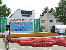 特設ステージを飾る背景画は、多くの人たちにふれあい広場への関心を持ってもらおうと、実行委員会が毎年市民からその図案を募集し、背景画の図案として士別南中学校の美術部に所属している生徒の作品がセットされていた。