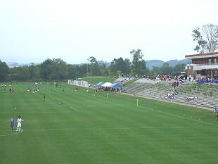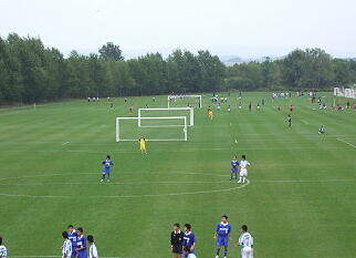ここのサッカー場は4面あります。全道大会にしては観客がすくない。 この後雨が降り出したのでずぶ濡れの試合になりそう。