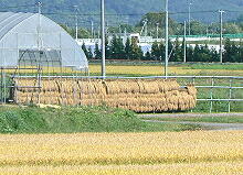 用事で旭川に行ってきたが、途中の上川農業試験場では盛んに稲刈りが行われていた。今年は作柄は天候に恵まれて豊作らしい。刈り取った稲は昔行われていた「ささかけ」をして自然乾燥していた。恐らく品種改良のためと思われる。