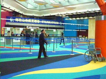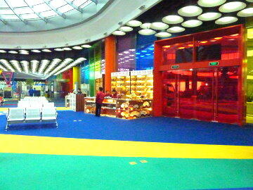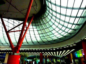 は非常に広く、使い勝手の良さそうなターミナルですが、外見の総ガラス張りと比較すると内部のケバケバしい色は