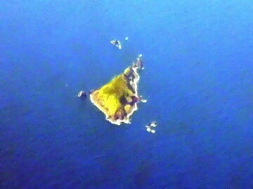 大島近くの鵜渡根島(無人島)(左)と利島(右)